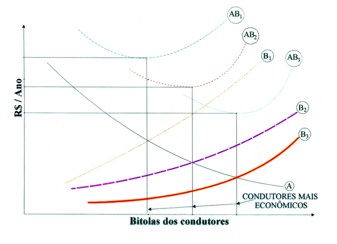 Na Figura 1 está ilustrado o processo de decisão associado a essa escolha. No eixo horizontal está indicado o aumento da bitola do condutor. No eixo vertical as consequências financeiras anuais dessa escolha. Pode ser observado que, na curva A, o aumento da bitola do condutor leva à diminuição das perdas, já, na curva B, esse aumento conduz à elevação dos custos com a concepção da linha. A soma dessas duas curvas gera a curva C (custos incrementais relacionados com o aumento da bitola). Como esperado, a curva C indica a existência de um ponto de mínimo: bitola ótima do condutor.