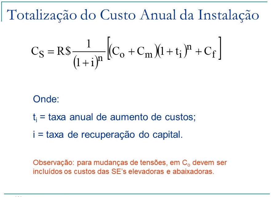 Onde Cp é o custo de produção, Cs o custo da instalação, I a taxa anual fixa de recuperação do investimento e PM a potência máxima transmitida. Esta formulação, apesar de mais elaborada traduz melhor o preço da energia perdida, sem incorrer em superfaturamento dessa grandeza e em erros graves na tomada da decisão quanto a escolha do condutor.