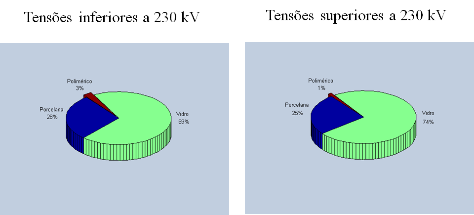 Após a borracha, inicialmente utilizada como isolante, passou-se a usar a porcelana, o vidro e materiais poliméricos. Na Figura 2 são ilustrados estatisticamente um retrato da aplicação desses materiais como isolante para linhas de transmissão. Observa-se o agrupamento por classe de tensão (inferiores a 230 kV e superiores a 230 kV). Na ocasião do levantamento, o uso de isoladores poliméricos ainda era insipiente, entretanto esse novo tipo de material isolante vem paulatinamente ganhando espaço perante os demais.