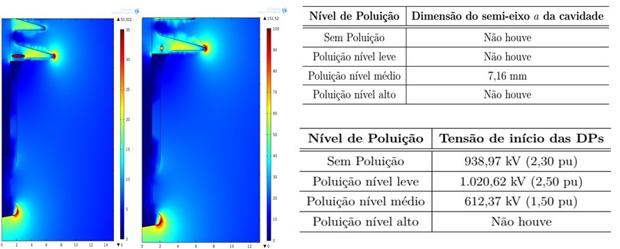 Os dois primeiros cenários descritos na Tabela 2 podem ocorrer muito raramente, no qual a cavidade esteja na posição de maior campo elétrico e o isolador seja submetido às sobretensões e níveis de poluição indicados na tabela. Essas condições, entretanto, caso venham a ocorrer, podem propiciar o início de um processo de degradação no interior da cavidade que cumulativamente redunde no colapso da unidade isolante. Por outro lado, a pior situação está relacionada com a possível existência de fissuras próximas à região de maior campo elétrico. Essa condição pode aparecer, na prática, especialmente quando a linha de distribuição é montada e um torque excessivo é aplicado sobre o isolador, na ocasião de sua fixação ao pino.