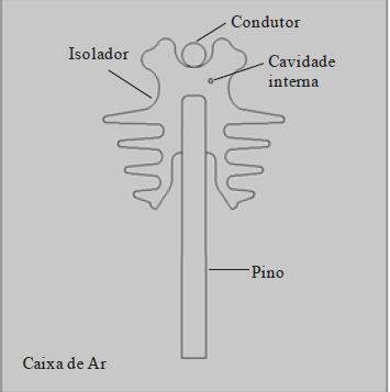 As simulações dos campos elétricos impostos às cavidades foram simulados com o suporte do aplicativo computacional CONSOL Multiphysics [3] acionado através de rotinas específicas elaboradas no MATLAB [4], para cada um dos formatos e localizações das cavidades detectadas. As geometrias envolvidas nas simulações compreendem o condutor, o isolador, a cavidade e o espaço de simulação (o ar circunvizinho ao isolador no formato de uma caixa). O arranjo completo encontra-se ilustrado na Figura 4.