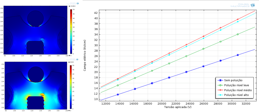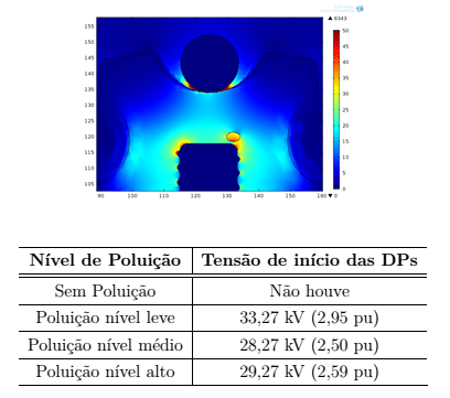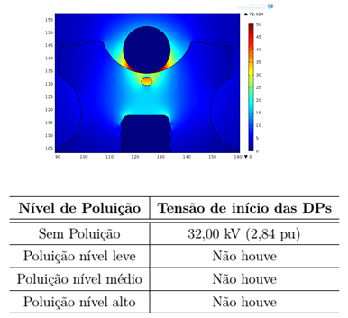 As simulações foram conduzidas de tal forma a aplicar 33,85 kV (3pu) entre o condutor e o pino. Essa condição foi imposta com o objetivo de submeter o isolador a um campo elétrico elevado o suficiente para “possivelmente” iniciar o processo de descargas parciais sobre as cavidades.