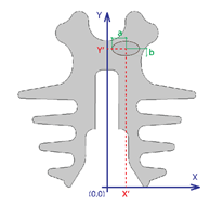 Foram adquiridos 254 isoladores, grande parte dos quais possuíam cavidades em seu interior, as quais foram detetadas e aferidas através de ensaios de raios x. Como a maioria das cavidades tinham um formato elipsoidal, suas dimensões foram caracterizadas pelos eixos “a”, “b” e “c”, centradas em suas coordenadas cartesianas x’, y’ e z’, como ilustrado em duas dimensões na Figura 3.