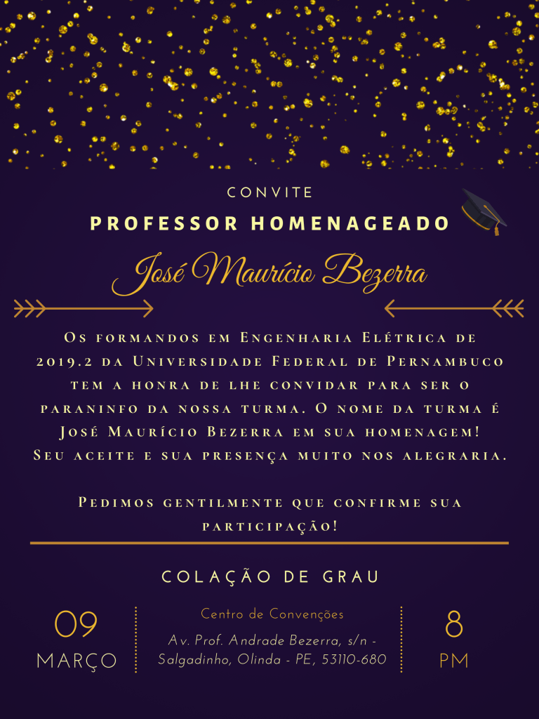 Em sequência aos pots que venho publicando, não poderia deixar de registrar dupla honraria que me foi concedida pelos formandos em Engenharia Elétrica da Universidade Federal de Pernambuco (UFPE), turma 2019.2, cuja colação ocorreu no dia 09/03/2019, no Centro de Convenções de Olinda/PE: nome da turma “Professor José Maurício de Barros Bezerra” e seu paraninfo. Segue foto dos gloriosos formandos e o gentil convite encaminhado.