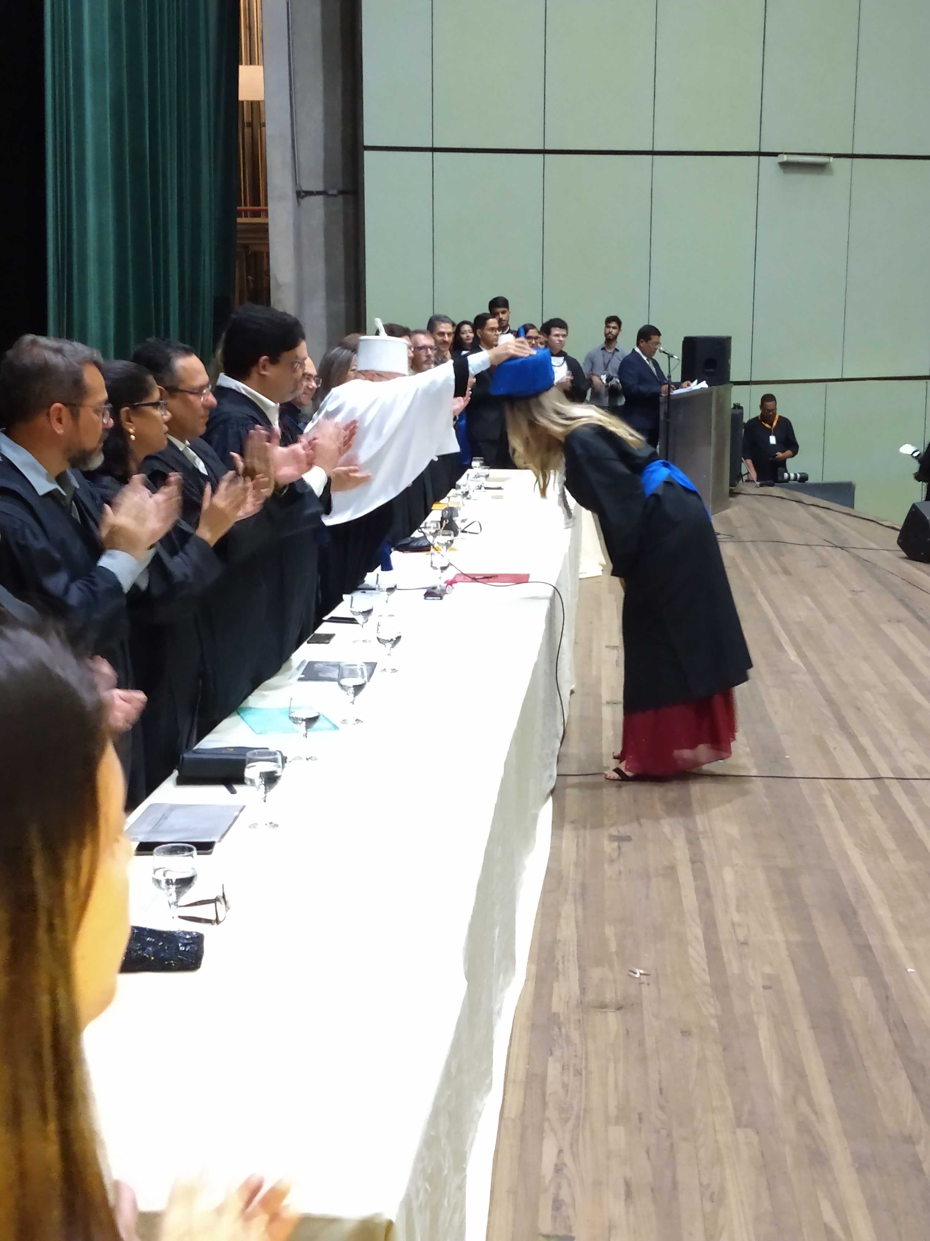 Representante da turma, Gabriela Calaça, sendo diplomada pelo Magnífico Reitor em nome de todos os formandos em Engenharia Elétrica – 2019.2.