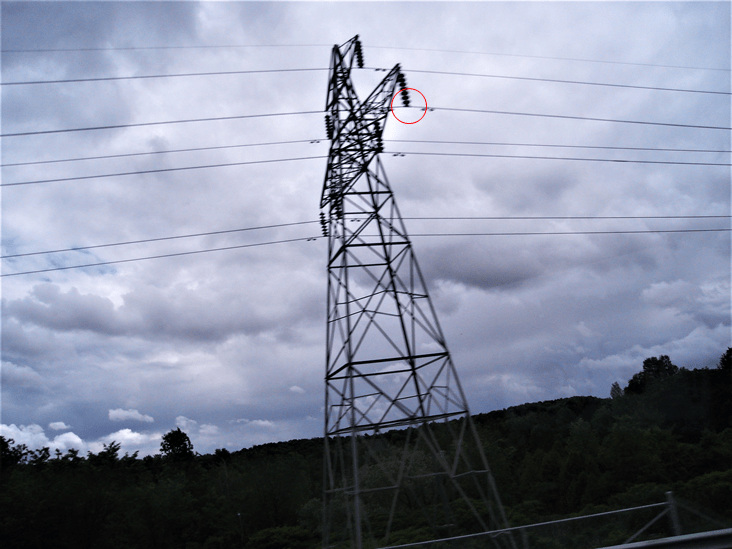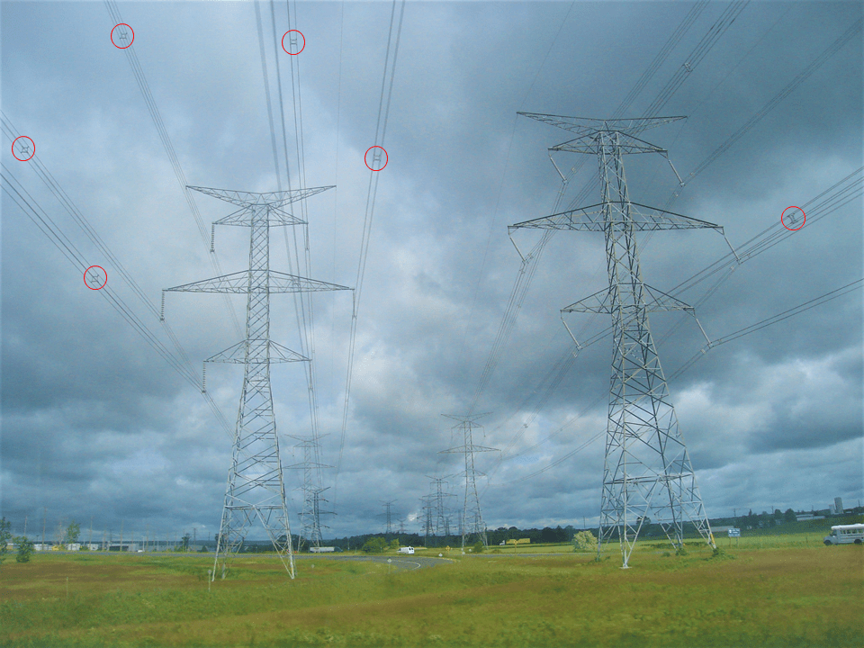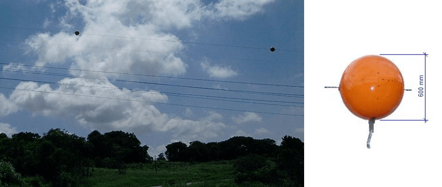 Na Figura 13, são ilustradas as aplicações de anéis equalizadores com esses fins. Observa-se que o condutor mais elevado, no caso o cabo para-raios, está sinalizado através dessas esferas. Observa-se, também, que, sem essas esferas, o cabo ficaria quase invisível.