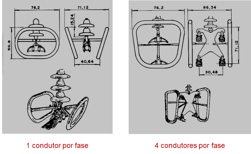 - ferragem para cadeia de isoladores – intensidade dos arcos elétricos (corrente de curto-circuito) peso e tração imposta aos condutores;