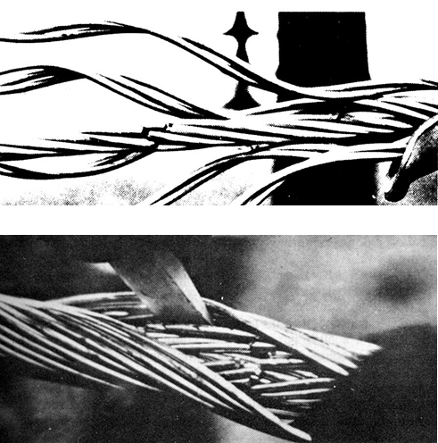 Mesmo com a evolução dos grampos de suspensão, técnicas modernas de projeto de linhas aéreas de transmissão de energia elétrica, procuram reduzir ao máximo os riscos de desgastes dos cabos condutores por vibração eólica, dada à sua característica acumulativa e às drásticas consequências associadas à rutura do cabo. Na Figura 4 são apresentados filamentos que compõem o cabo condutor, os quais foram rompidos por vibração. O mais preocupante deste processo é que a rutura desses filamentos se dá de dentro para fora, sob os grampos de suspensão, se caracterizando um defeito de difícil localização, o que pode conduzir todo o cabo à sua ruptura.