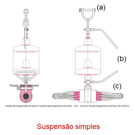 Para realizar a sua função isolante, e também mecânica, as cadeias de isoladores incorporam diversas ferragens adicionais. Na Figura 9, são ilustradas algumas delas, utilizadas na suspensão simples: