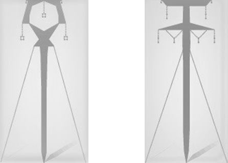Na Figura 3, fica evidenciada a tendência do projeto de torres para linhas de transmissão, onde se procura economizar na quantidade de material utilizado para a sua constituição (aço, no caso). A estrutura estaiada veio para substituir as autoportantes, de tal forma a se inserir quatro estais (tirantes em aço) para dotar a estabilidade necessária à estrutura, enxugando o uso do aço exaustivamente utilizado nas estruturas auto portantes. A estrutura monomastro representa uma evolução às estruturas estaiadas, de tal forma a enxugar ainda mais o uso do aço. Observa-se que, em vez de dois mastros para a sua sustentação é utilizado apenas um, incorporando uma economia adicional significativa em relação à tecnologia anterior. Na Figura 4, são ilustrados dois projetos de estruturas mono mastro alternativos, sendo o primeiro para circuito simples e o segundo para circuito duplo triangular.