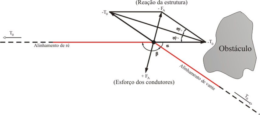 Por outro lado, as estruturas de ângulo, de derivação e de transposição realizam papéis importantes no sistema de potência. As estruturas de ângulo permitem que o trajeto da linha possa sofrer uma mudança de direção para contornar eventual obstáculo (reservas ambientais, acidentes geográficos, centros urbanos, etc.), conforme ilustrado na Figura 7. Nessas condições, a estrutura se torna obrigatória no vértice do ângulo e deve suportar esforços adicionais na bissetriz do ângulo (beta), podendo requerer a instalação de estais no sentido oposto a essa bissetriz ou a opção por uma estrutura de ancoragem, a depender da magnitude do ângulo de desvio (alfa).