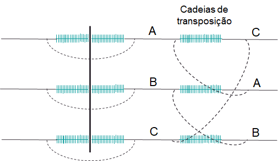As estruturas de transposição têm a função de permitir a transposição das fases de tal forma a beneficiar o sistema de potência na minimização dos desequilíbrios inerentes a linhas longas (maior que 100 km). A grosso modo, também são estruturas de ancoragem, com o diferencial da introdução das “cadeias de transposição”, a quais provêm a nova sequência de fases pretendida, conforme ilustração feita na Figura 9, na qual as linhas tracejadas indicam “pulos” que fazem as ligações em plano inferior ao apresentado. Esse é um esquema utilizado para linhas de até 230 kV. As cadeias de transposição, logicamente, são mais longas que as de ancoragem, uma vez que ficam submetidas à tensão fase-fase. Para linhas de tensão mais elevadas, a transposição é feita em dois vãos, utilizando duas estruturas simétricas, ilustradas na Figura 10, as quais permitem a inversão da sequência de fases ao longo dos vãos. Esse novo esquema é preferido, diante da manifestação acentuada do efeito corona, caso fosse utilizado o esquema ilustrado na Figura 9.