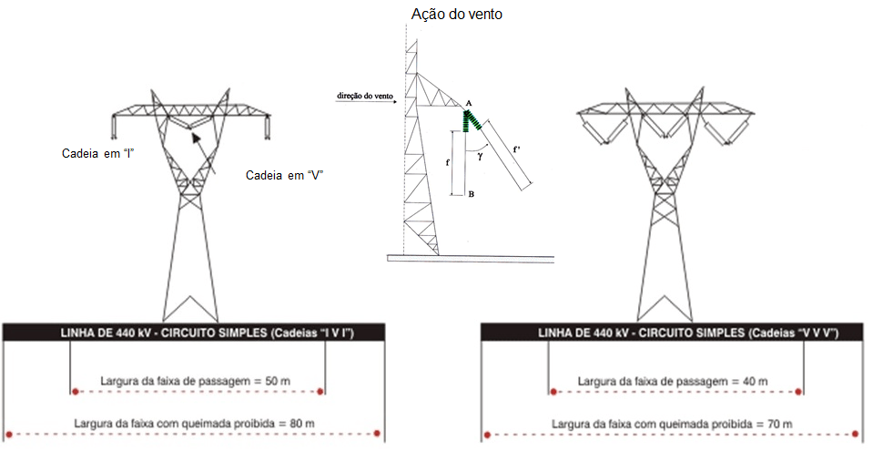 Um detalhe adicional também deve ser considerado na alternativa da estrutura a ser escolhida: o balanço das cadeias de isoladores. Esse balanço está associado aos esforços do vento atuante transversalmente à linha de transmissão. Sob a ação desses esforços, a cadeia pode ser inclinada na direção da estrutura ou se afastando dela. No primeiro caso, pode causar a aproximação do condutor à estrutura e consequente risco de abertura de um arco elétrico, caracterizando um curto-circuito fase-terra e a retirada intempestiva da linha de operação, através dos sistemas de proteção. No segundo caso, a faixa de servidão deve incorporar esse deslocamento do condutor, implicando em aumentar a sua largura. Para evitar esses balanços, pode-se restringir os graus de liberdade da cadeia de isoladores, na estrutura, através da utilização de cadeias em “V”, conforme ilustrações registradas na Figura 14. É importante lembrar que a adoção dessa alternativa, torna a estrutura mais compacta e a faixa mais estreita, mas incorpora o dobro de cadeias de isoladores, como também aumenta o risco de falhas desses componentes. Torna-se, portanto, uma escolha técnico-econômica, na qual o preço da faixa a ser indenizada representa um fator decisório significativo.