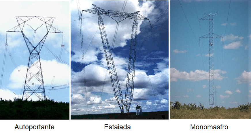 Quanto às funções das estruturas, elas podem ser projetadas para suportar cargas verticais, horizontais transversais, e/ou cargas horizontais longitudinais. Por tipo de carga a suportar, as estruturas podem ser classificadas em estruturas de suspensão (suportam cargas verticais), de ancoragem (suportam cargas longitudinais e são também chamadas de amarração), para ângulos (podem ser de suspensão ou ancoragem, a depender da intensidade do ângulo), de derivação e de transposição. Quanto à forma de resistir, as estruturas podem ser classificadas em auto-portantes (rígidas, flexíveis, mistas ou semi-rígidas) ou estaiadas. As estruturas auto-portantes, como o próprio nome diz, se sustentam sozinhas, utilizando quatro pontos de apoio ao solo, mas um uso intensivo de aço para prover essa característica. Já as estaiadas requerem a aplicação de quatro estais para suprir a estabilidade necessária, como veremos adiante. Nas Figuras 1 a 5 são ilustradas algumas estruturas utilizadas em linha de transmissão.