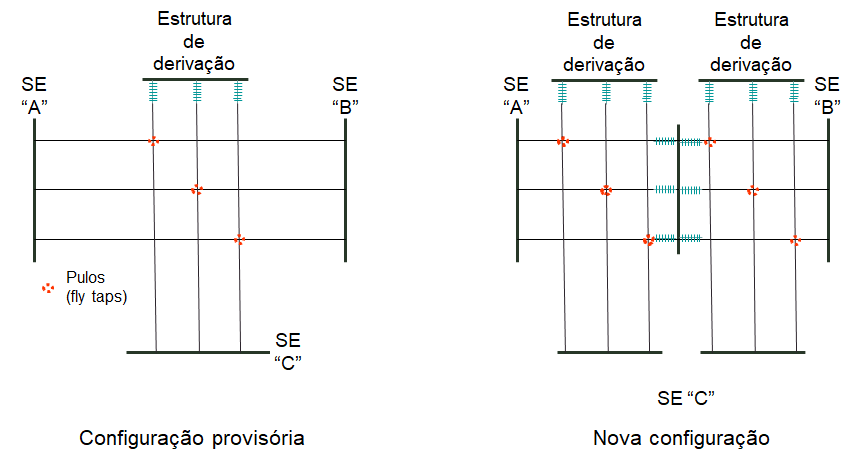 As estruturas de derivação têm a função de alimentar uma terceira subestação que venha a se instalar próxima do traçado de uma linha já existente, conforme registra a ilustração contida na Figura 8. Essa alimentação passaria a ser feita de forma mais confiável a partir da evolução para uma nova configuração. Nessa nova situação, a linha A-B seria seccionada, passando a surgir duas novas linhas, A-C e C-B, com todas as vantagens inerentes à operacionalidade, confiabilidade e esquemas de proteção associados. A estrutura de derivação, para todos os efeitos, é uma estrutura de ancoragem, apenas com uma função diferenciada.