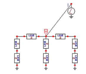 Nesta situação, os contrapesos foram modelados como tendo 150 m de comprimento, já que o espaço entre torres é de 300 m. Como eles agora estão dispostos em pares ao invés de quartetos, deve-se atentar para a resistência equivalente, que foi dividida por dois ao invés de quatro, obtendo-se o valor de 100 Ω. Na Figura 7 é ilustrada a montagem feita, no ATP, com essas considerações.