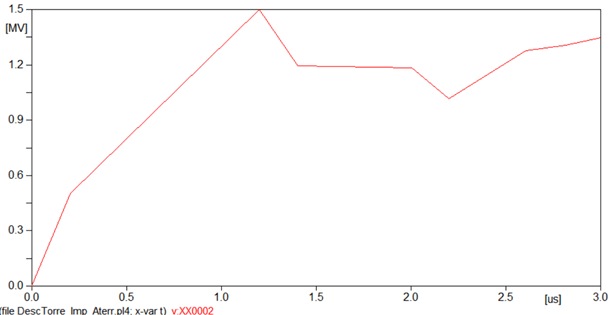 Essas características e premissas podem ser melhor visualizadas através da ilustração contida na Figura 1. Nesta figura são representadas as duas grandezas de interesse: impedância de aterramento e surto atmosférico. Neste caso, a frente de onda é considerada igual a 1,5 microssegundos, a impedância de aterramento inicial 220 e o valor final (resistência de aterramento) igual a 20 Ω.