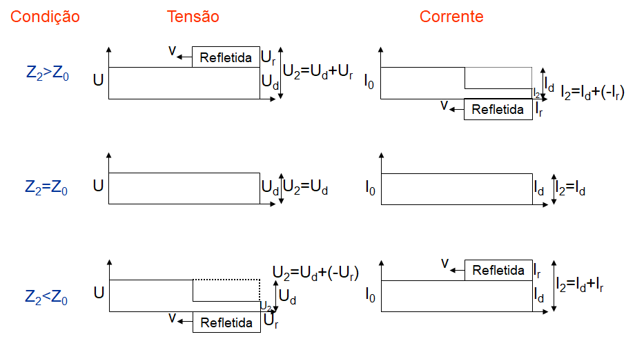 Quando do encontro das terminações, ilustradas na Figura 4, as três considerações feitas anteriormente tomam os formatos ilustrados na Figura 8, na qual as ondas viajantes refletidas passam a possuir sinal positivo ou negativo a depender da relação entre Z2 e Z0. As ondas refletidas passam a se sobrepor às ondas incidentes, aumentando ou diminuindo as grandezas de tensão ou corrente, readequando o perfil desses valores ao longo da linha de transmissão. A condição Z2=Z0 é caracterizada como uma situação em que não surgirão ondas refletidas.