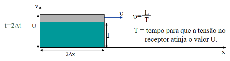 Este mesmo gráfico, decorridos dois intervalos de tempo “delta t”, teria a forma apresentada na Figura 3, na qual se observa que dois segmentos elementares estariam energizados. Nesta figura se infere, também, que o processo de energização terá uma velocidade dada por:
