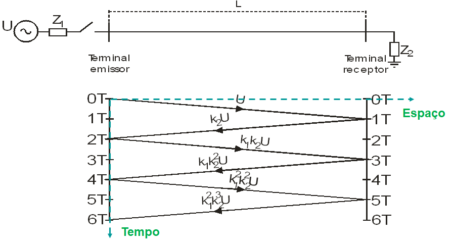 O diagrama de treliças desempenha um papel acadêmico muito importante para se visualizar como as ondas viajantes se desenvolvem ao longo do tempo e do espaço. Permite, também, construir o comportamento da tensão em pontos específicos da linha de transmissão, como, por exemplo, os seus terminais. Na Figura 9 são ilustradas uma linha de transmissão, sendo energizada a partir de uma fonte, com impedância interna Z1 e o diagrama de treliças associado. Neste diagrama, o eixo horizontal representa o deslocamento da onda viajante ao longo da linha e o eixo vertical permite aferir o seu desenvolvimento ao longo do tempo. O tempo “T” representa a duração da onda percorrer toda a linha de transmissão, desde o terminal emissor até o terminal receptor. Os coeficientes de reflexão estão identificados como K1 para o terminal emissor e K2 para o terminal receptor. “L” representa a extensão da linha.