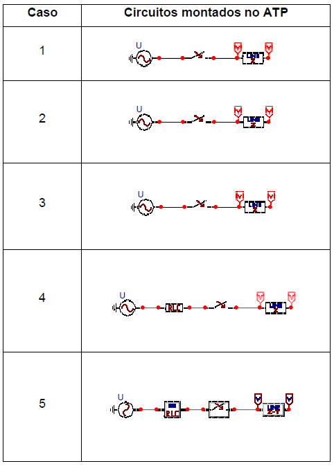 Na Tabela 3 são registrados os circuitos montados no ATP para cada um dos casos analisados. Observe que, em todos os casos, está havendo monitoração da tensão nos dois terminais.