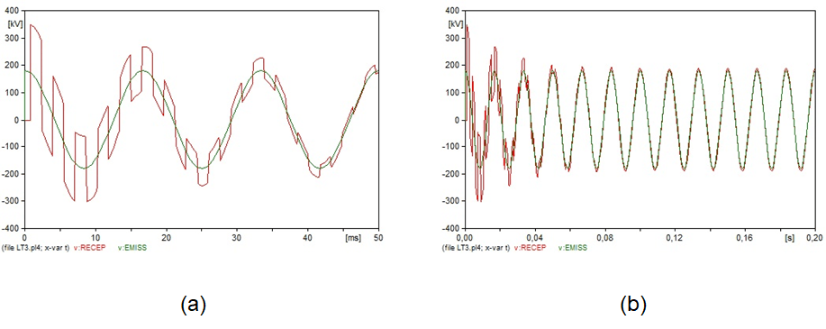 Os gráficos das tensões nos dois terminais encontram-se ilustrados na Figura 10. O gráfico referente ao terminal emissor caracteriza um resultado plenamente esperado, uma vez que ele está alimentado por uma fonte ideal, a qual impõe o valor da tensão (igual a 1 pu, para o caso). Já o gráfico referente ao terminal receptor caracteriza uma situação bastante inusitada: enquanto a fonte de tensão emite um sinal constante de 1 pu, este sinal será alternado, variando entre 0 e 2 pu, incorporando uma sobretensão significativa a este terminal.