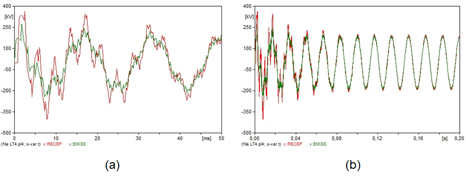 Na Tabela 1, encontram-se registrados todos os valores das tensões nos dois terminais, escolhendo-se criteriosamente os intervalos de tempo de interesse, os quais são caracterizados por momentos anteriores a chegada de cada onda viajante no terminal observado. É importante lembrar que, quando do impacto da onda viajante em cada terminal, ocorrerá um acréscimo de tensão no terminal, caracterizado pela soma algébrica da tensão incidente mais a tensão refletida.