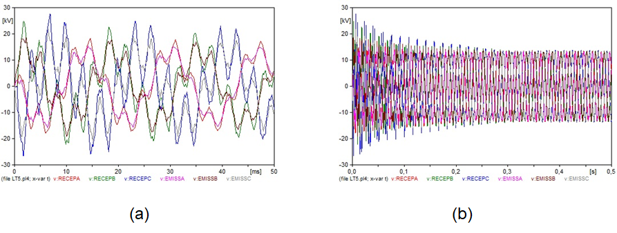 Observa-se que, em todos os casos simulados, os quais incorporaram a presença de elementos resistivos (circuitos 2, 3, 4 e 5), houve uma amortização da sobretensão no terminal receptor, caracterizada pela dissipação do excesso de energia, através do efeito Joule. Apenas no circuito 1, o qual representa uma situação de uma linha ideal, sem elementos resistivos, o excesso de energia continuaria circulando no circuito e o terminal receptor ficaria indefinidamente submetido às sobretensões. Uma outra observação para esses circuitos (2, 3, 4 e 5) é que os valores da tensão no terminal receptor convergem para os valores impostos pela fonte de tensão, após a amortização.