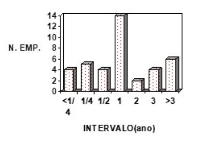Na Figura 1, são explicitadas as periodicidades de inspeções minuciosas praticadas pelas empresas que participaram do levantamento [3]. Ficou caracterizado que a frequência dessas inspeções está associada com a frequência das inspeções expeditas. Um número limitado de empresas executa ambas as inspeções com a mesma frequência. Entretanto, a natureza das inspeções minuciosas varia bastante entre empresas, desde uma simples inspeção visual da estrutura até uma inspeção de partes críticas.
