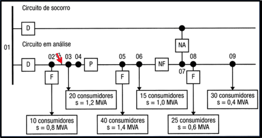 A título de ilustração, na Figura 6, é exemplificado um sistema de distribuição, o qual é submetido a uma falha, entre os nós 02 e 03. Nessas condições, os seguintes marcos podem surgir como ações da proteção/operação/manutenção: