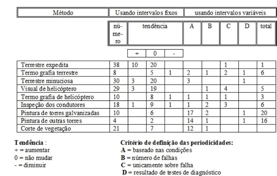 De uma forma geral as empresas têm dedicado grande importância às inspeções visuais quando do levantamento das necessidades de manutenção. Os métodos tradicionais de inspeções terrestres expeditas, combinadas com inspeções minuciosas são usados intensamente. Entretanto, tem sido crescente o uso de inspeções aéreas, particularmente, para inspeções com termovisores. A título de referência, na Tabela 1 são apresentadas periodicidades básicas praticadas por empresas diversas [3].