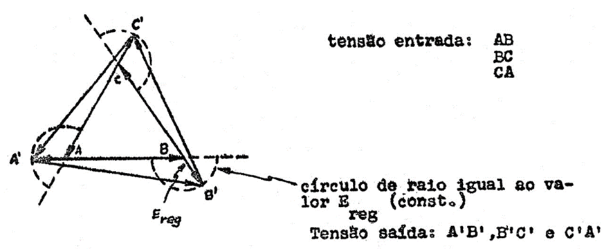 Figura 5 – (a) Ilustração da ligação do regulador trifásico em delta e (b) – diagrama fasorial, indicando os pontos operacionais mais importantes [1].