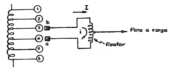 - (c) – posição 3, a parte a do comutador se desliga do ponto 4 e se fecha sobre 3, pondo em curto o reator e restabelecendo as condições da posição 1, apenas agora com transferência para a derivação 3.