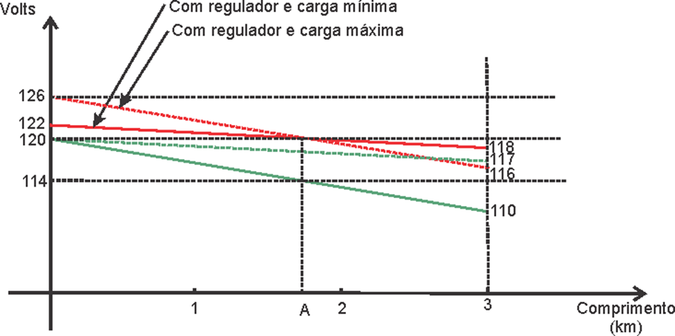 - a regulação percentual do regulador será a percentagem de elevação necessária, ou seja, (126-120)/120 = 5%, tendo o ponto de ajuste (A), equivalente, na curva a (120 V; 1,5 km).