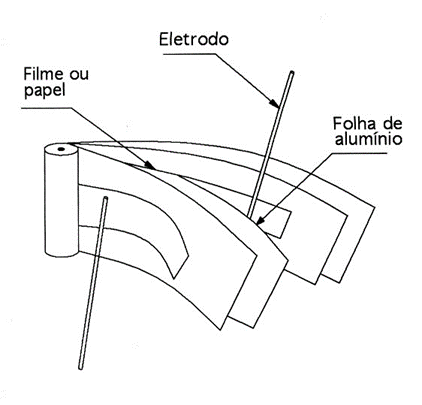 ARMADURA: é constituída de folhas de alumínio enroladas com o dielétrico, com espessuras compreendidas entre 3 e 6 µm e padrão de pureza de alta qualidade, a fim de manter em baixos níveis as perdas dielétricas e as capacitâncias nominais de projeto, conforme ilustração contida na Figura 19.