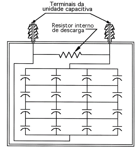 RESISTORES DE DESCARGA: são componentes que evitam situações perigosas de contato com os terminais. Eles transformam em perdas Joule a energia armazenada, reduzindo para 5V o nível de tensão num tempo máximo de 1 min para capacitores de tensão nominal de até 660 V, e de 5 min para capacitores de tensão nominal superior. O dispositivo resistivo pode ser instalado interna ou externamente, sendo mais comum o interno, conforme ilustrado na Figura 20.