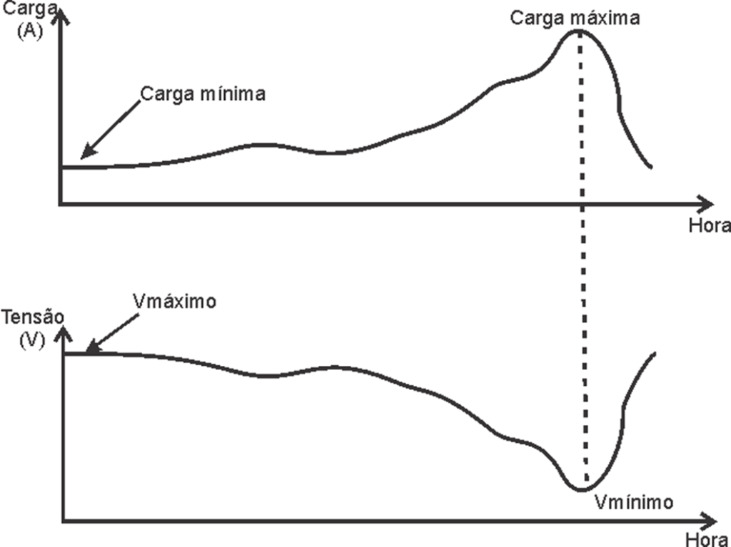 Na Figura 1 é possível observar a flutuação da tensão, em conformidade com a variação da carga, sem que haja a ação de eventual processo de regulação. Pode-se verificar que a tensão máxima (Vmáx) ocorre, quando da carga mínima, enquanto que a tensão mínima (Vmin) ocorre, quando da carga máxima.
