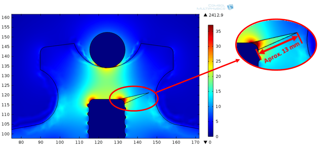 COMSOL Multiphysics® é um poderoso ambiente interativo para modelagem e resolução de diversos tipos de problemas da ciência e de engenharia [8]. Permite estender para modelos multifísicos, solucionando problemas com físicas acopladas de maneira simultânea. Para desenvolver esse tipo de aplicação não é necessário um conhecimento profundo em matemática ou análise numérica. Na resolução dos modelos, se utiliza a conhecida técnica de elementos finitos. Nas Figuras 12, 13 e 14 são ilustrados resultados de simulações através desse aplicativo [9] [10] [11] [12] [13].