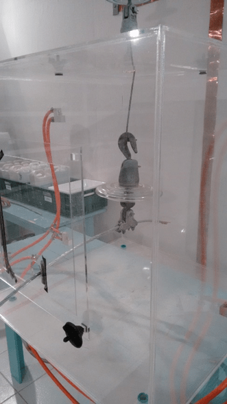 - avaliação do desempenho de isoladores padrão submetidos ao depósito de material contaminante e inserido em ambiente úmido [4]; vide Figura 25;